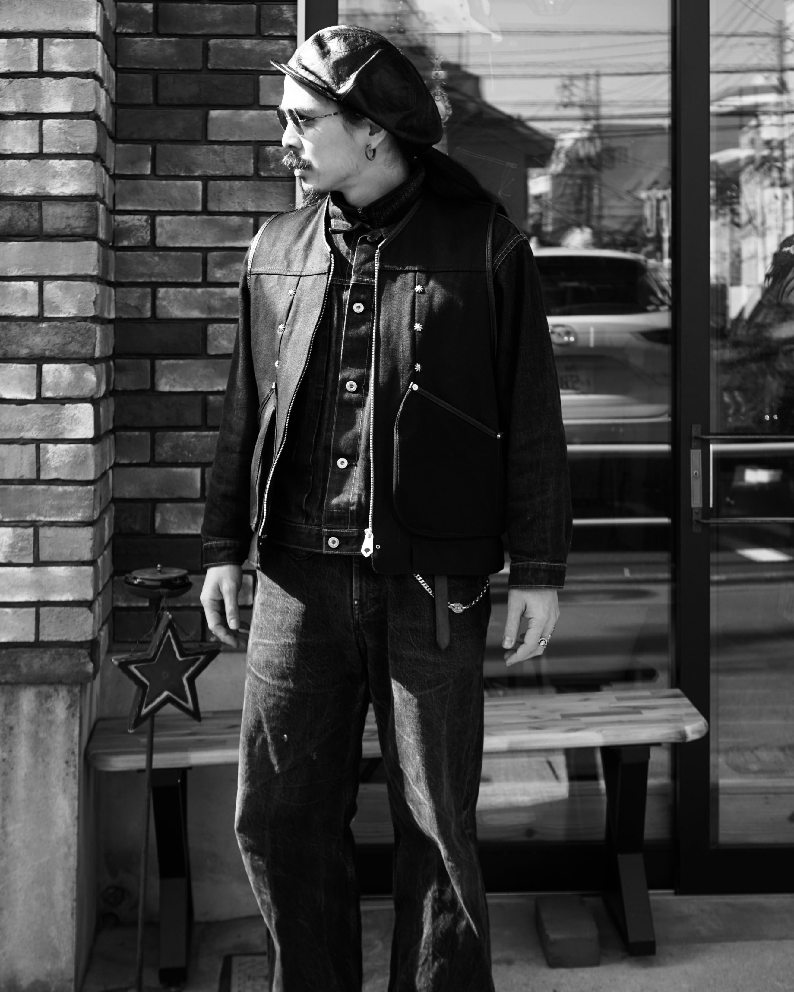 シルバー925でファスナートップ、HALOスタッズをのせた スペシャルブラックデニムベスト203。 Material:Silver925 /Rivet Copper Fabric:100%cotton Okayama denim ALL HAND MADE