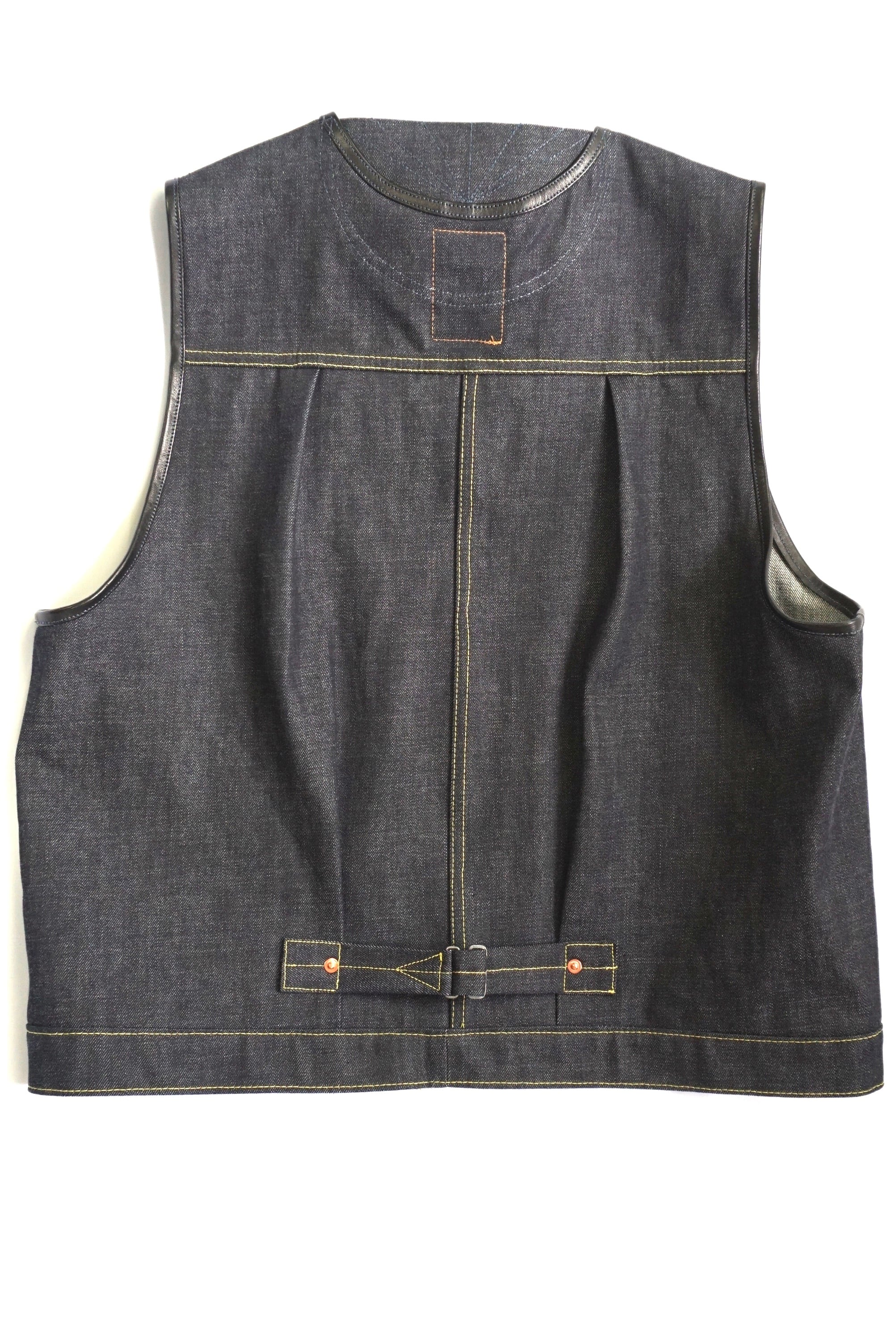 レザージャケットの上からでも着れるワイドアームホール仕様でオールシーズン着れるベストの完成。