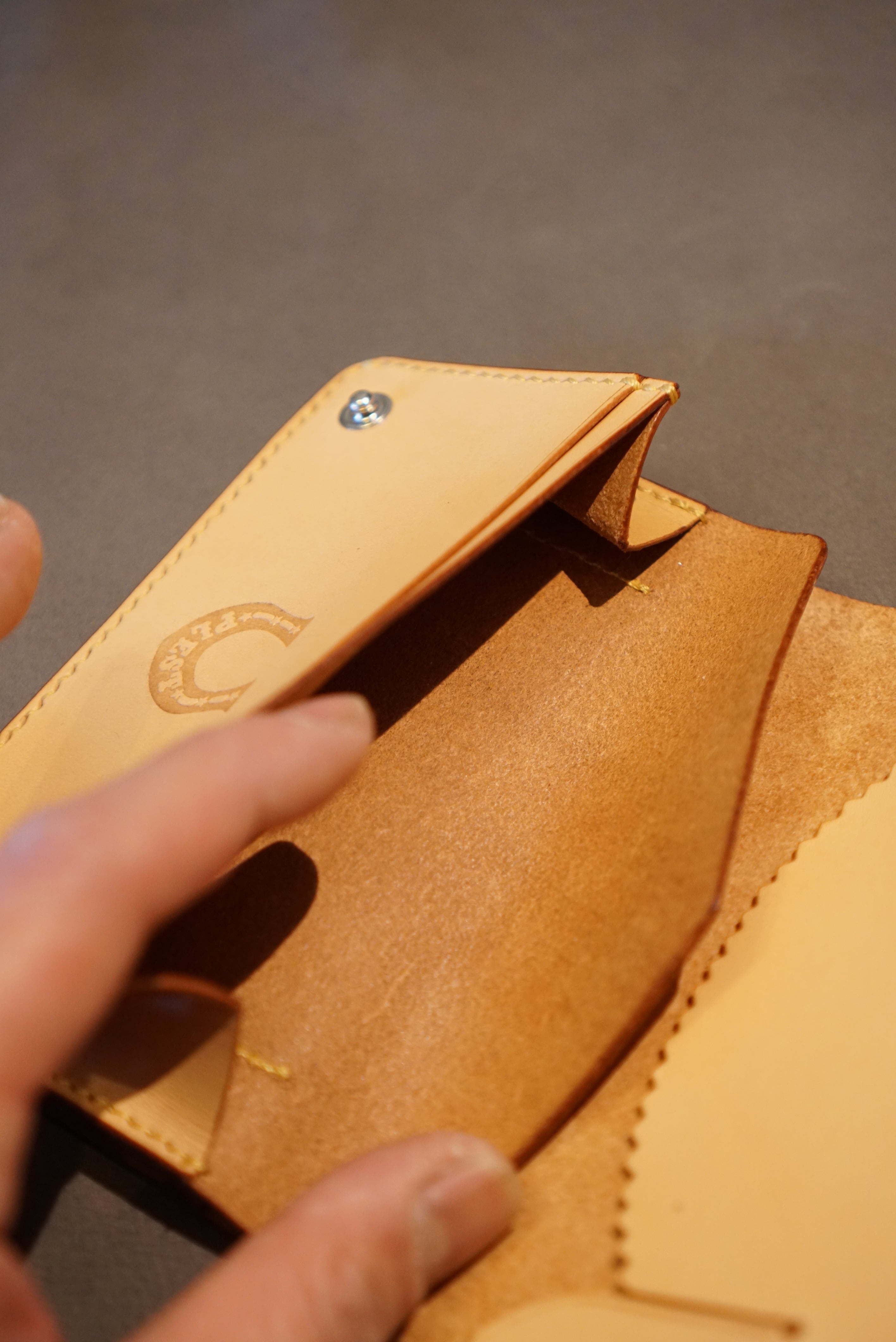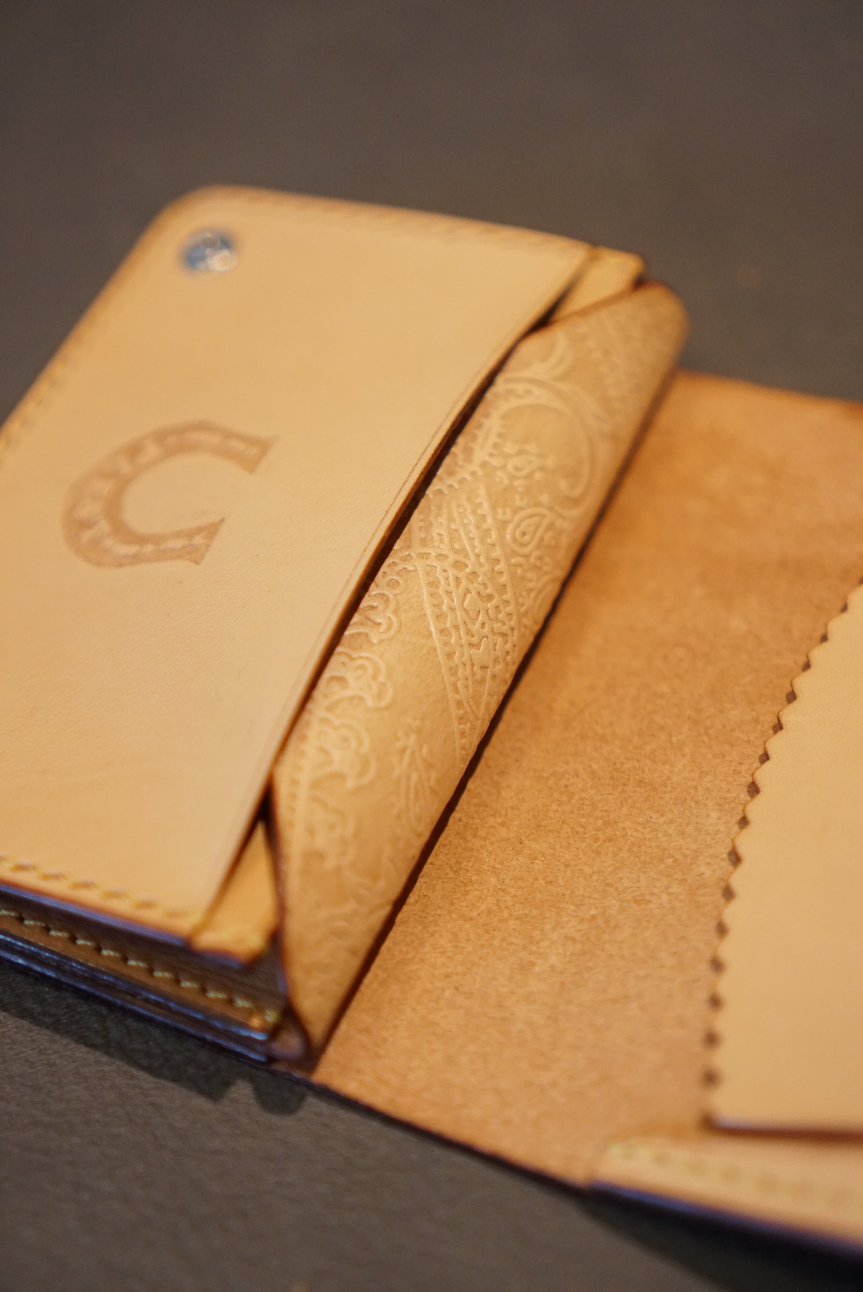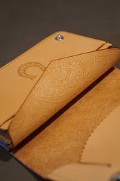 ・財布の顔とも言える表には、ステッチに合わせ たラインを入れている。これは”飾り捻(ねん)”と 言われる伝統的な技法であり、仕上げの工程で 一つ一つ焼き付けています。