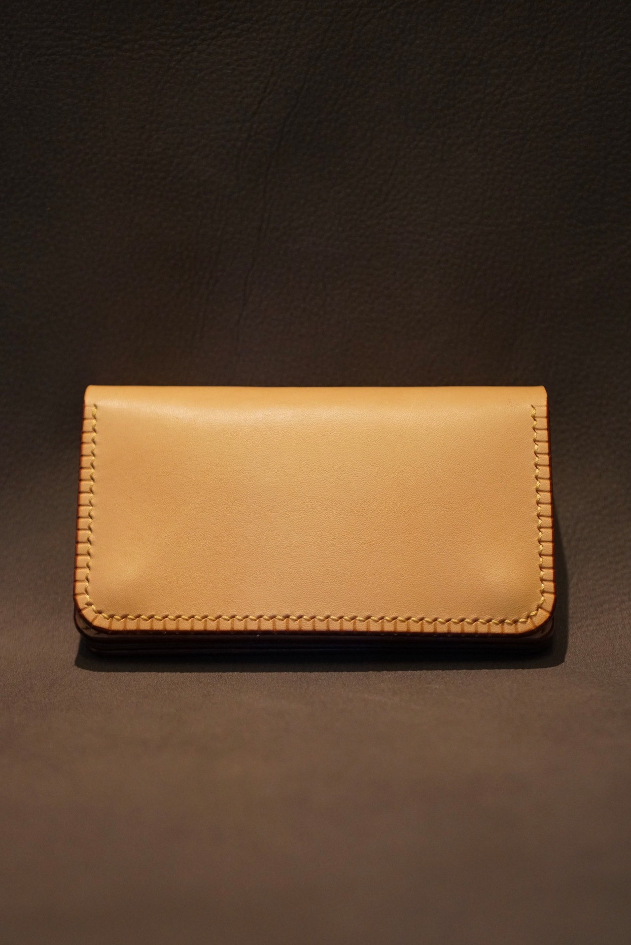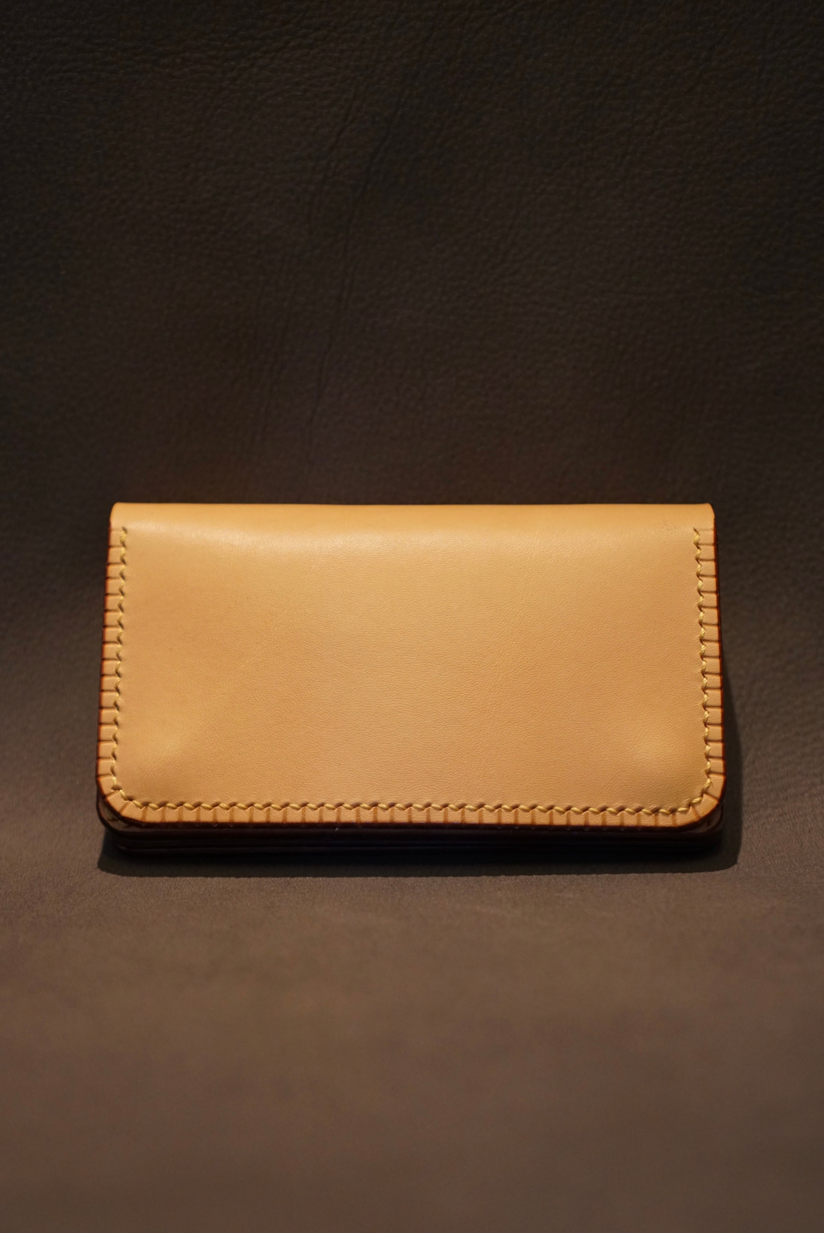 天然ヌメ革の柔らかな風合いに明るい黄色いス テッチがアクセントとなった財布。