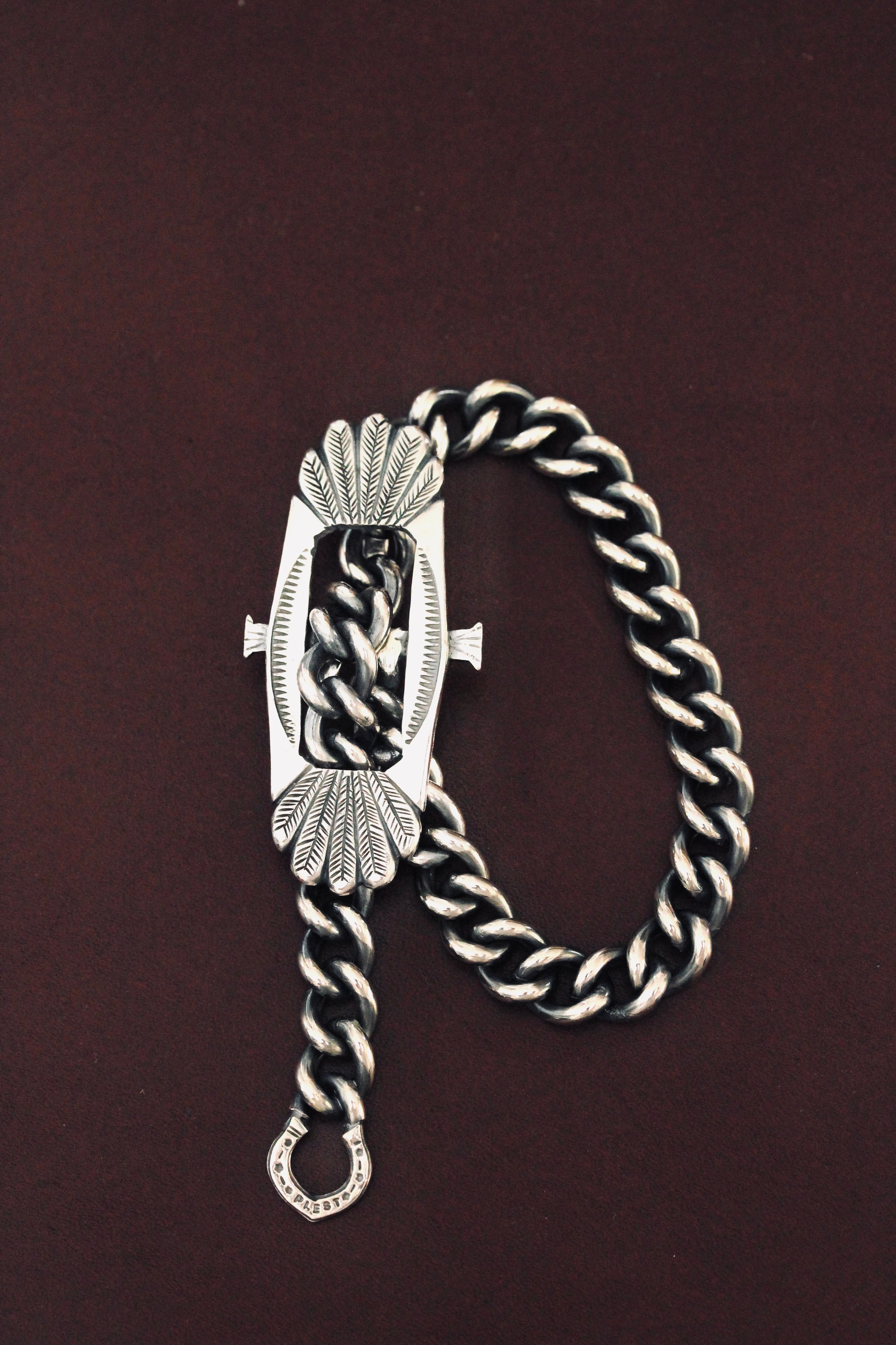 そこにチェーンを通してフックにかけてサイズ調整ができるようにした、今までにないブレスレットの完成。