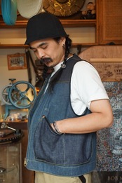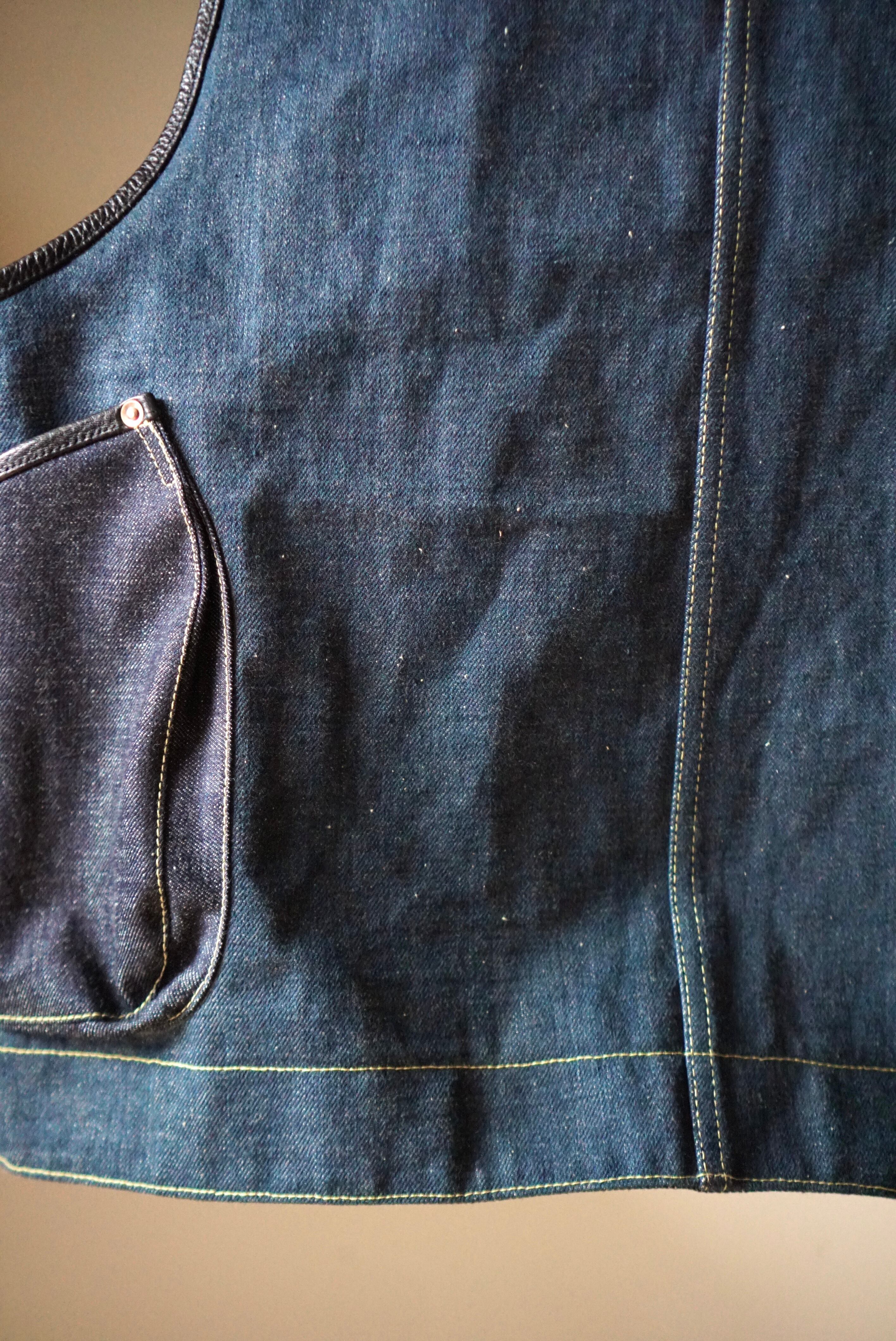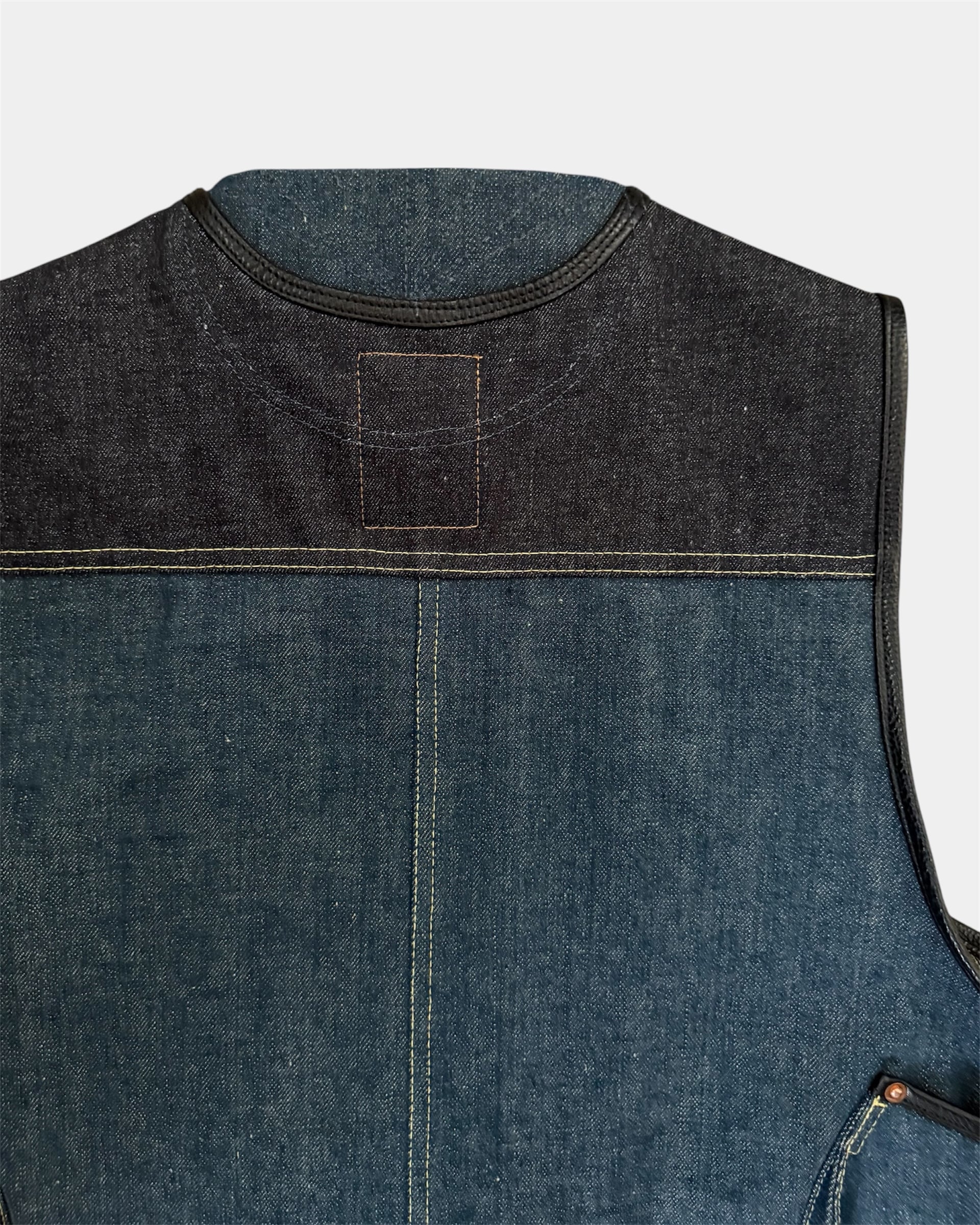 オリジナルの真鍮タイプファスナートップをのせた13オンスデニムベスト。