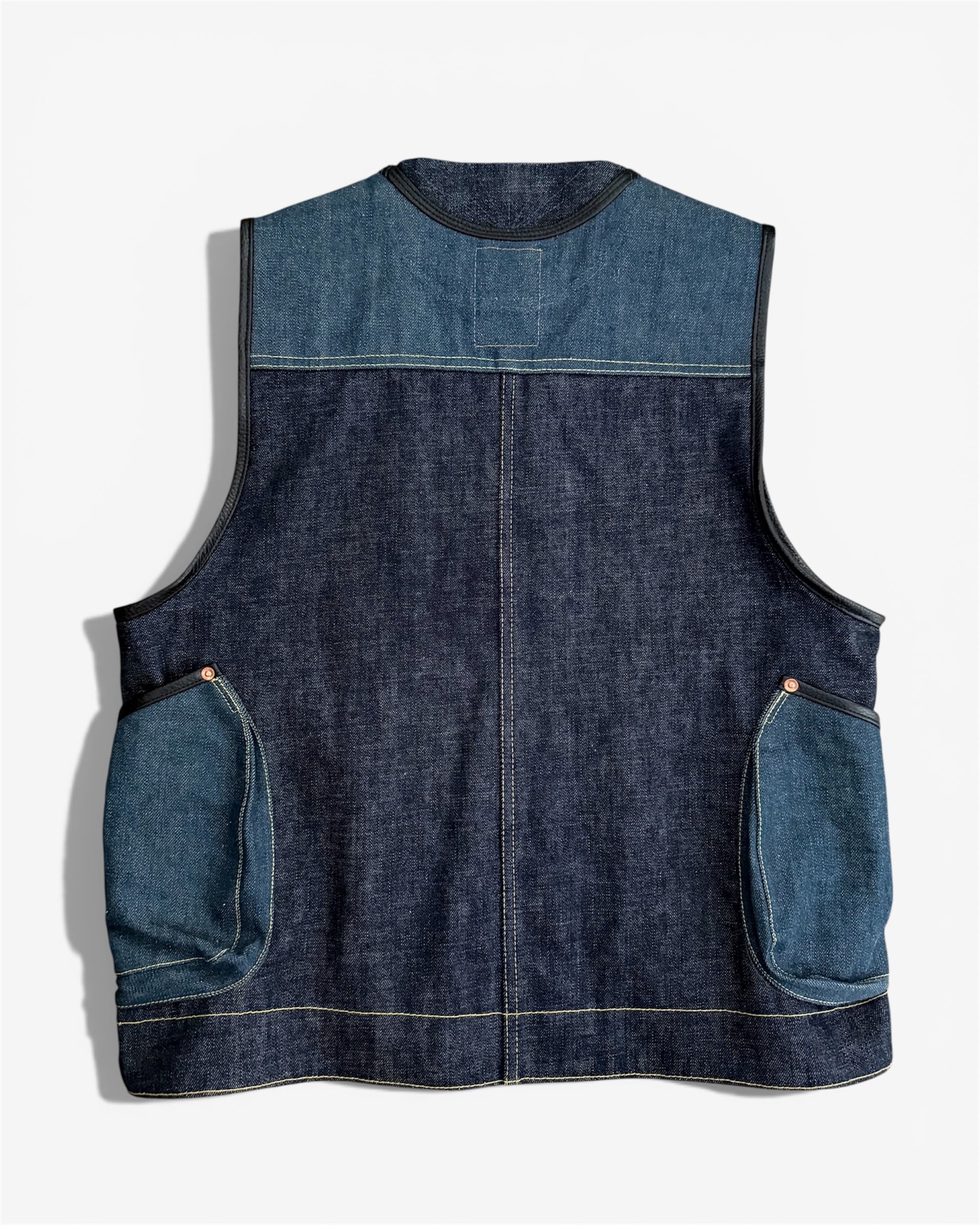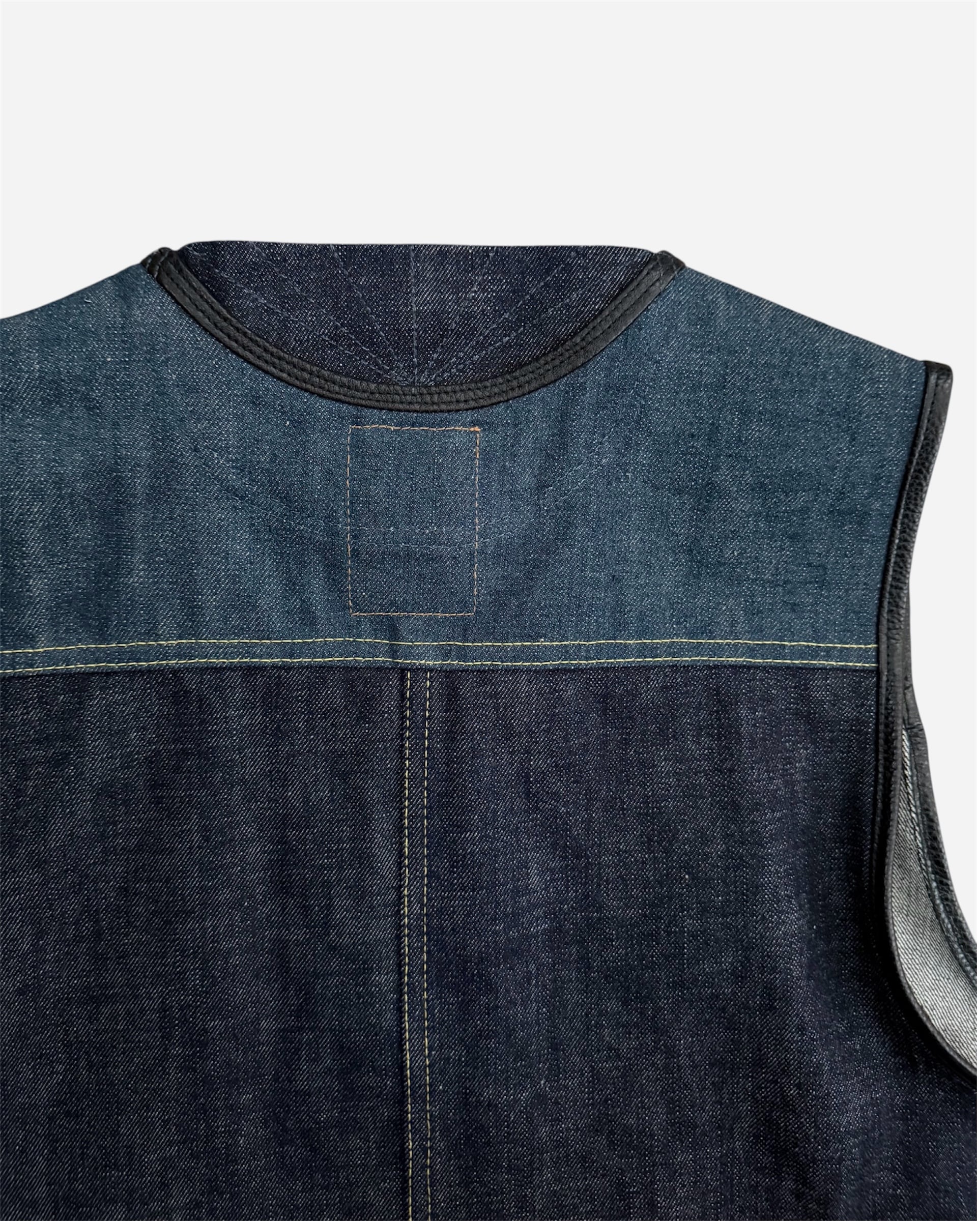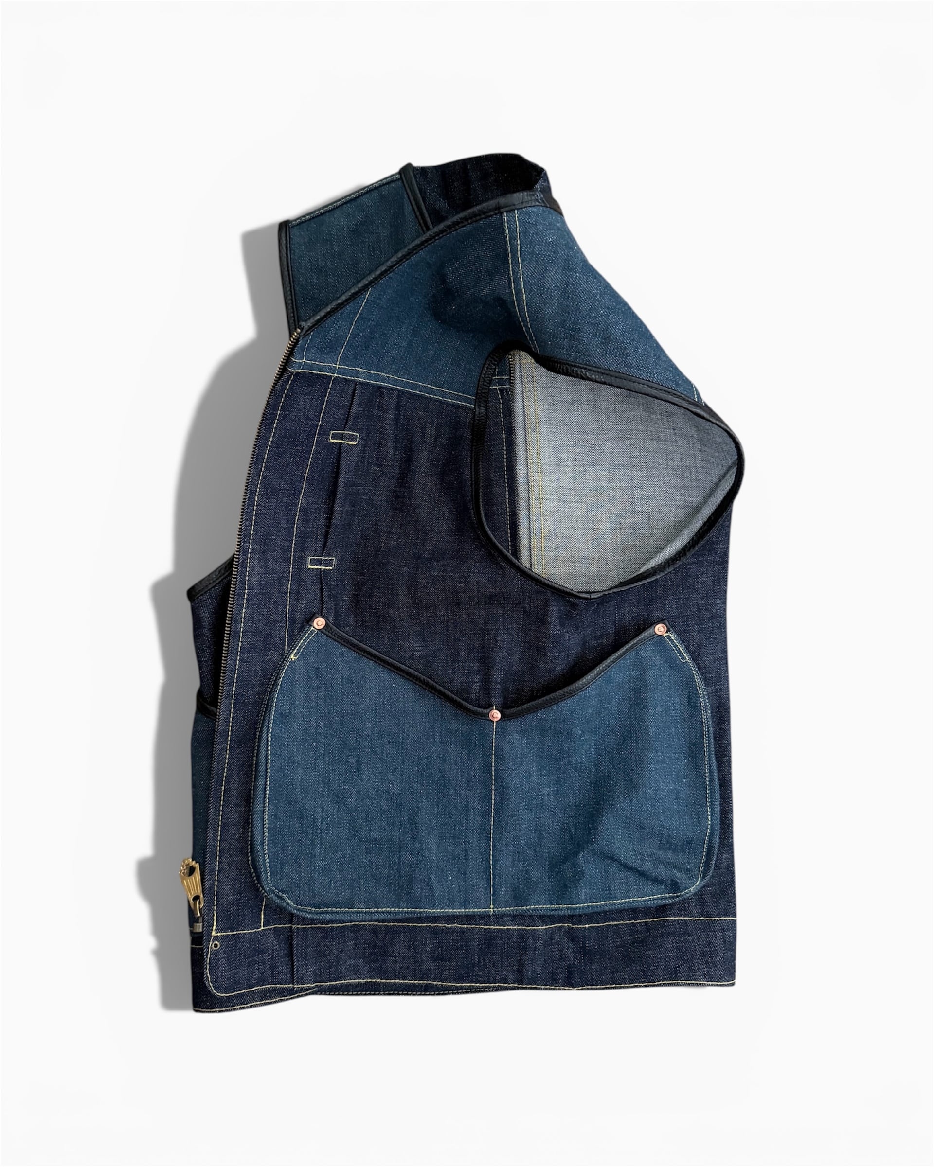 オリジナルの真鍮タイプファスナートップをのせた13オンスデニムベスト。