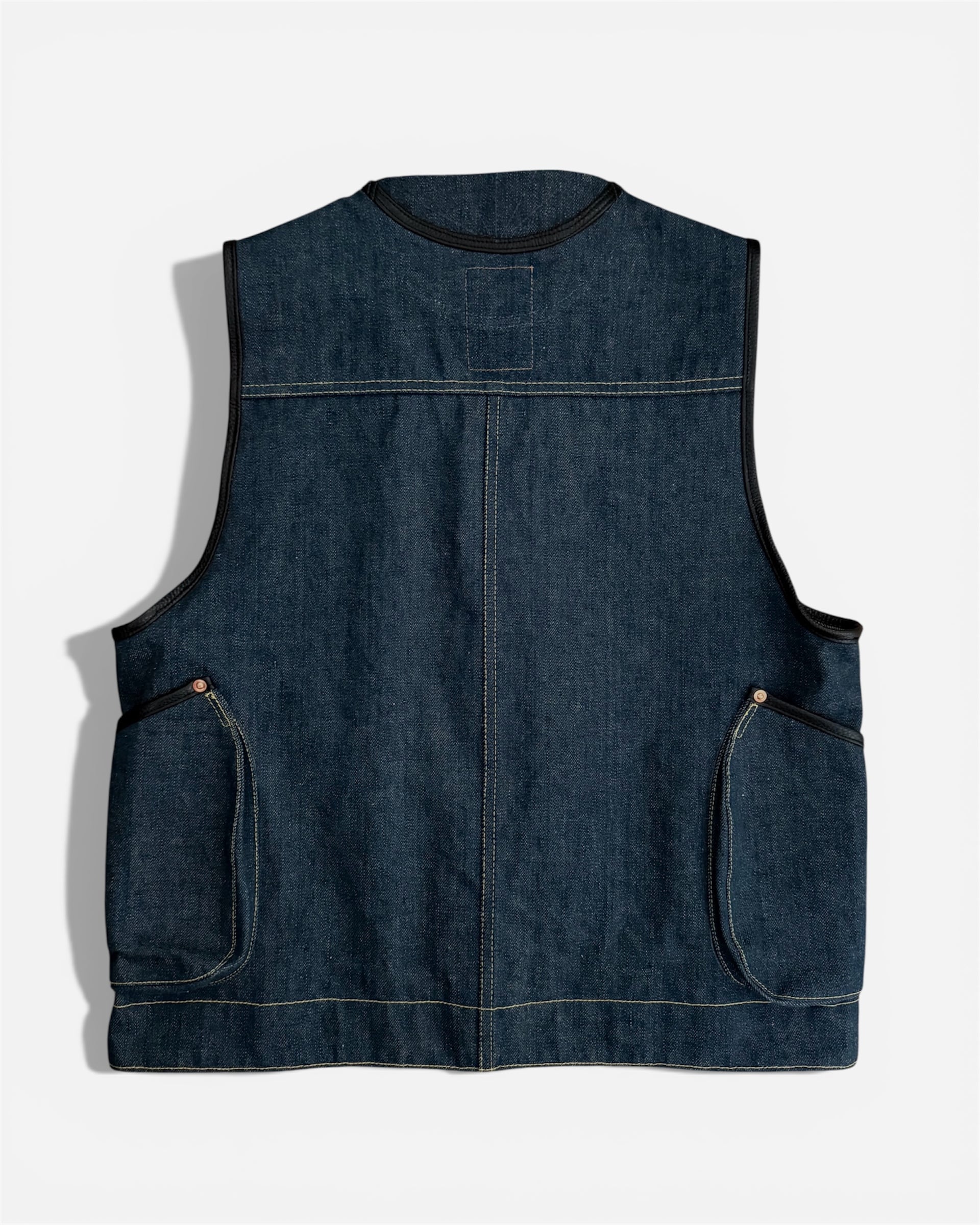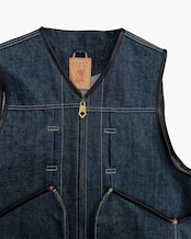 オリジナルの真鍮タイプファスナートップをのせた13オンスデニムベスト203。