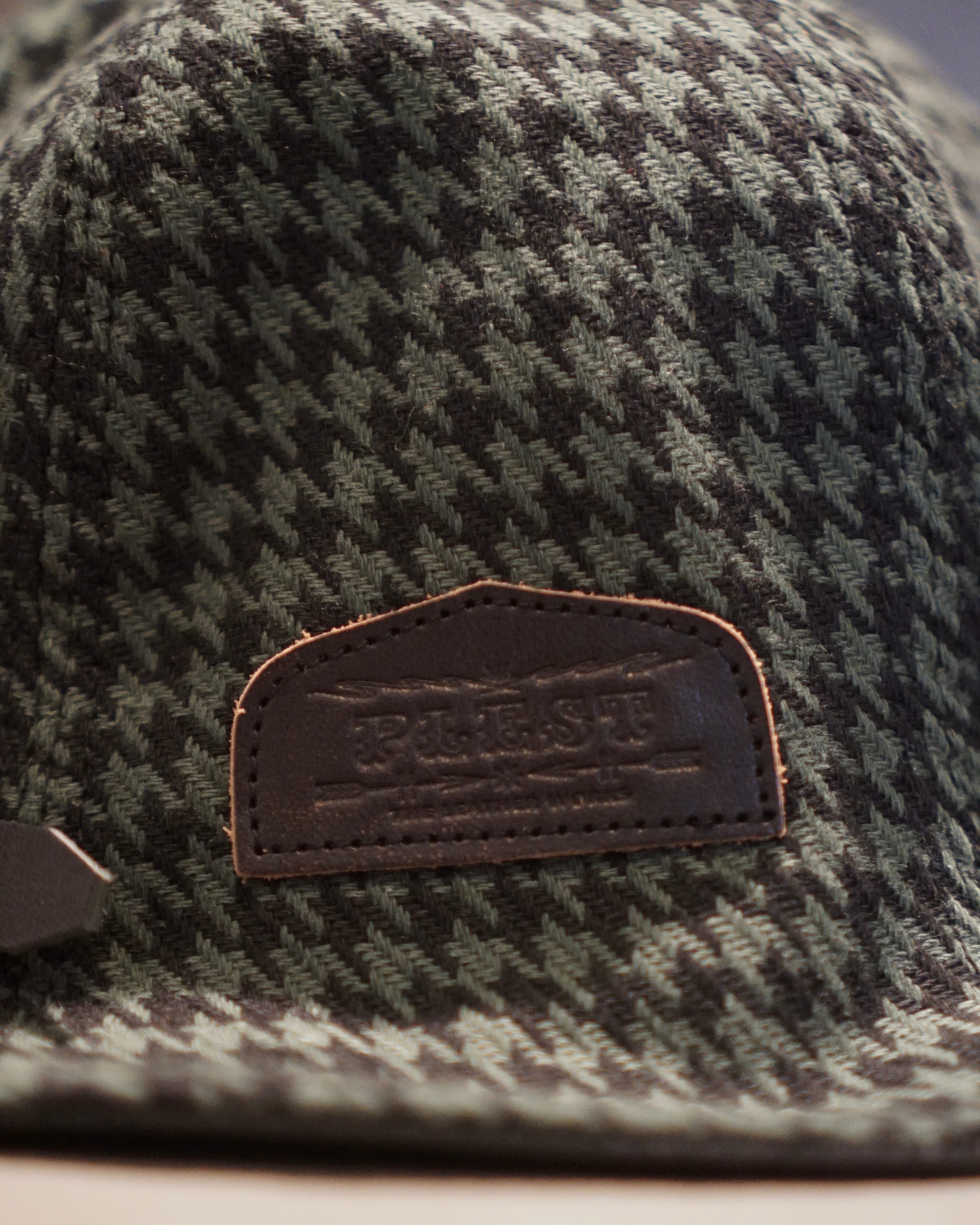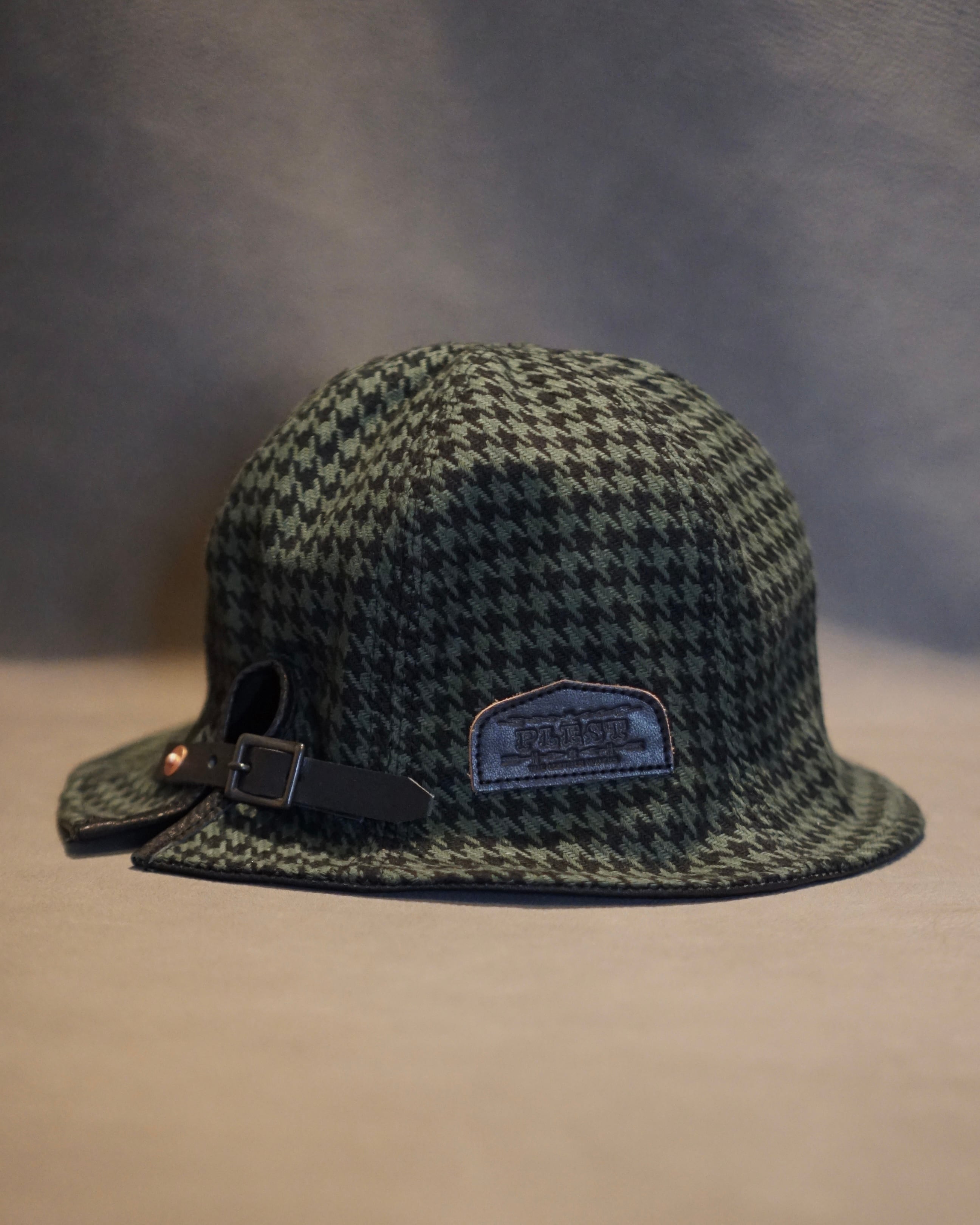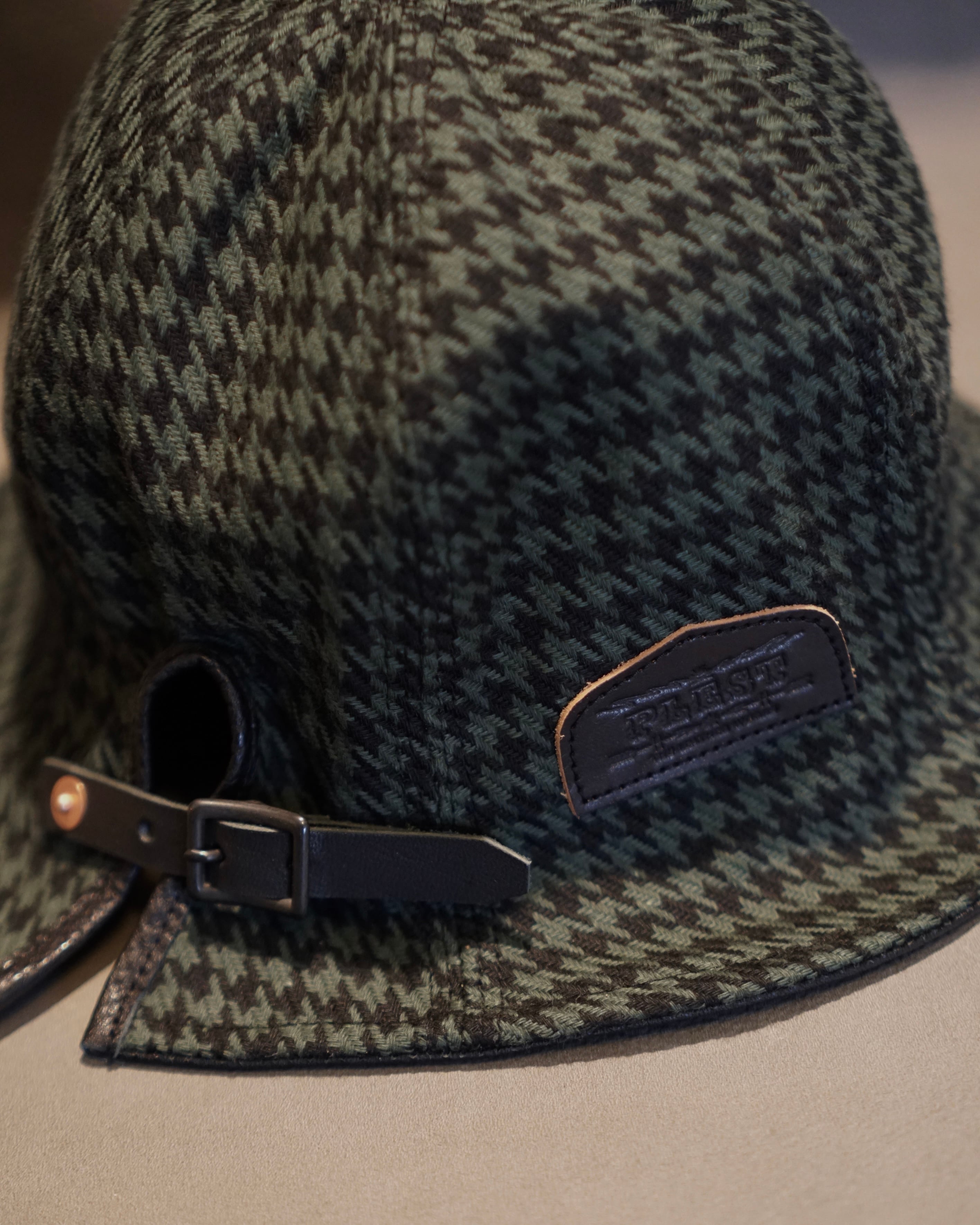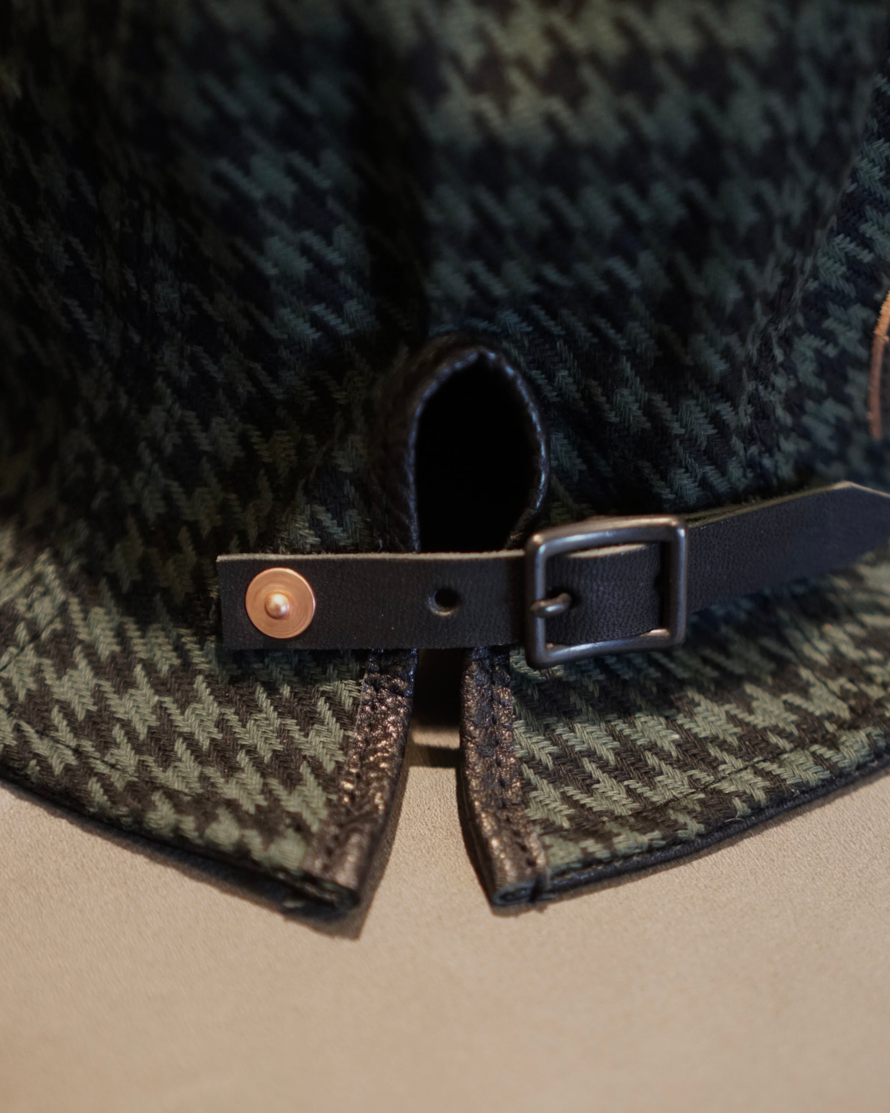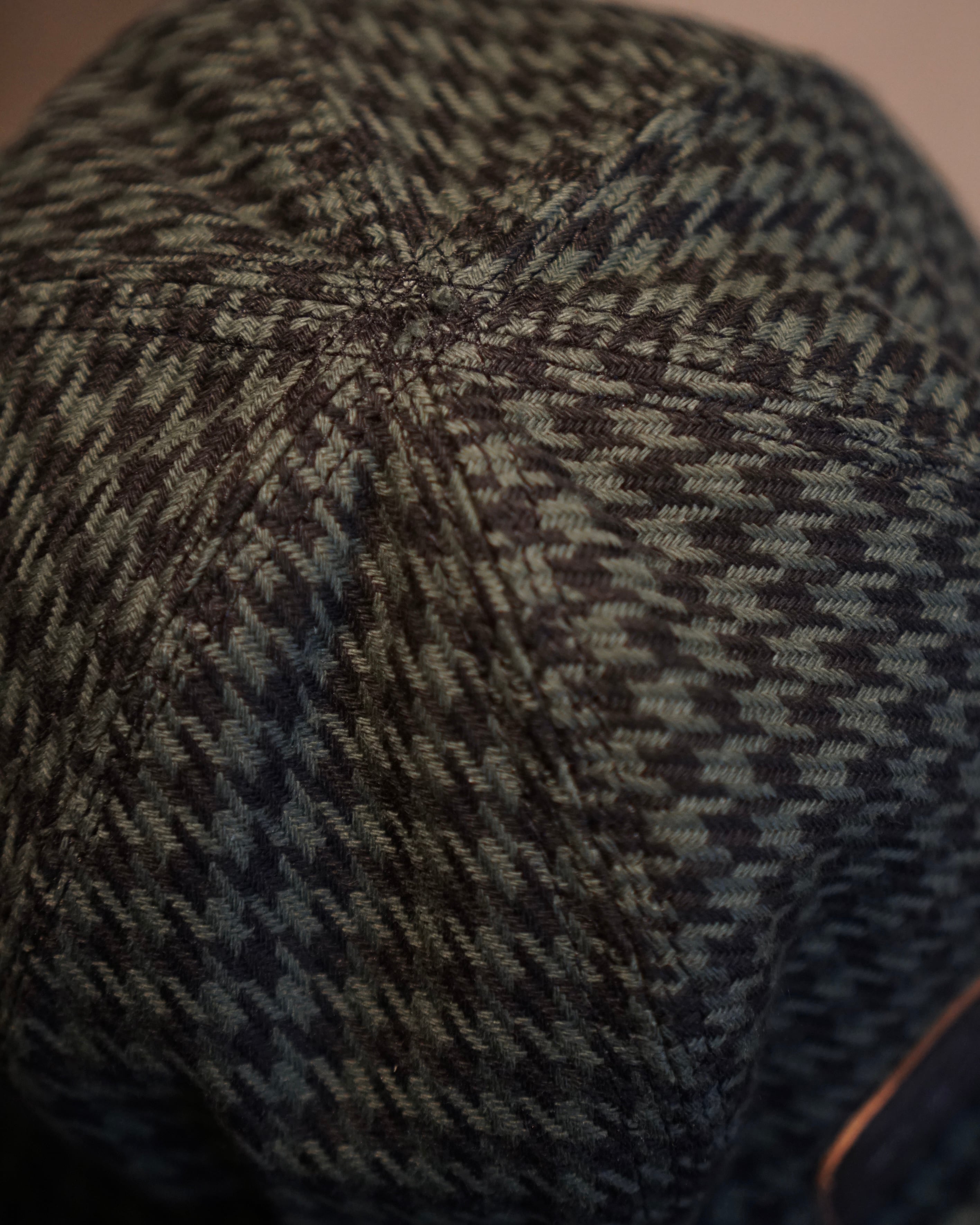 コットンヘリンボーン織り千鳥格子ファブリックを用いて上下左右バラバラに柄合わせして仕上げた6パネルハット、ドランカーズハット。