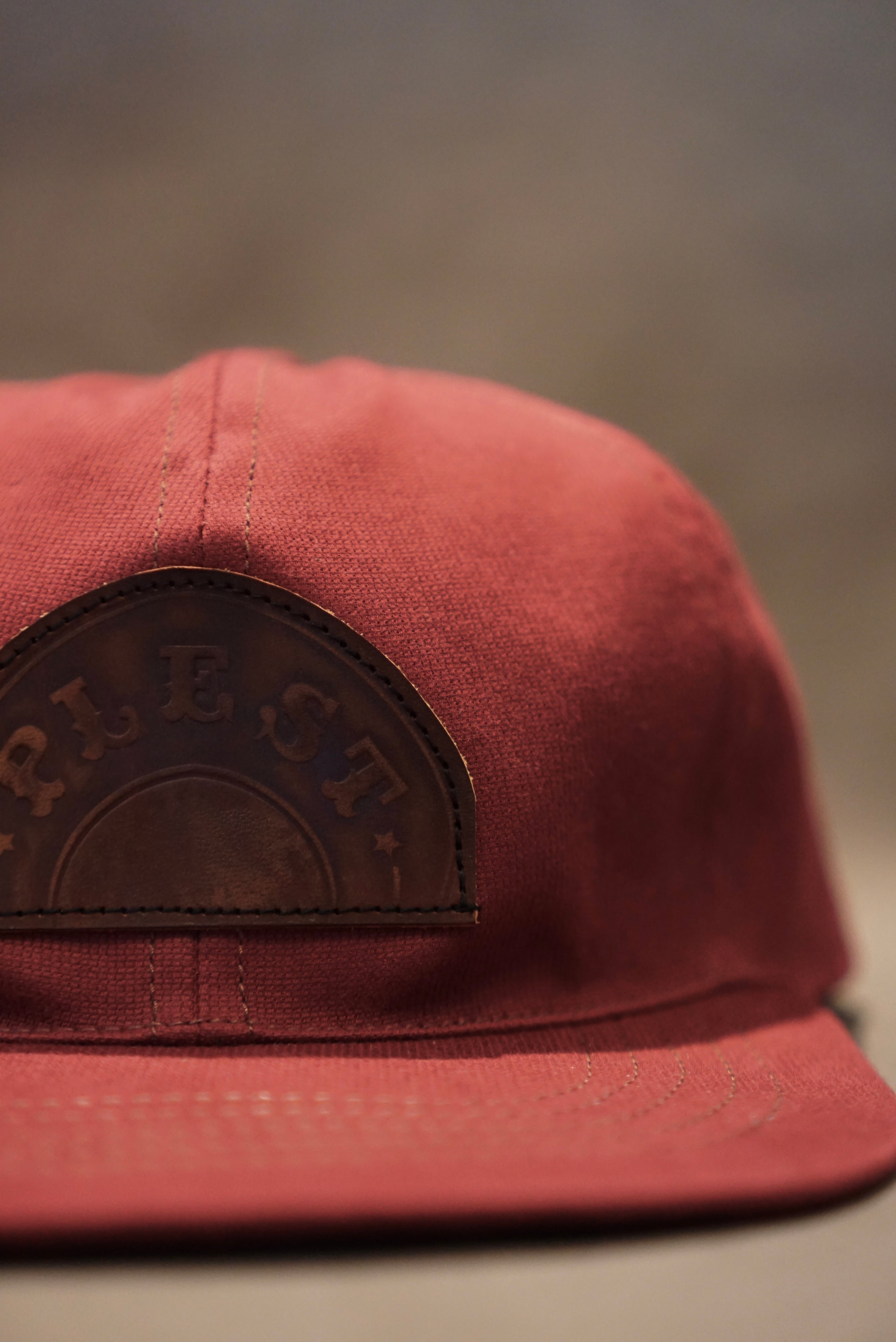 古臭さをテーマにヴィンテージ加工を施した茶芯レザーのハウス型パッチをのせた。