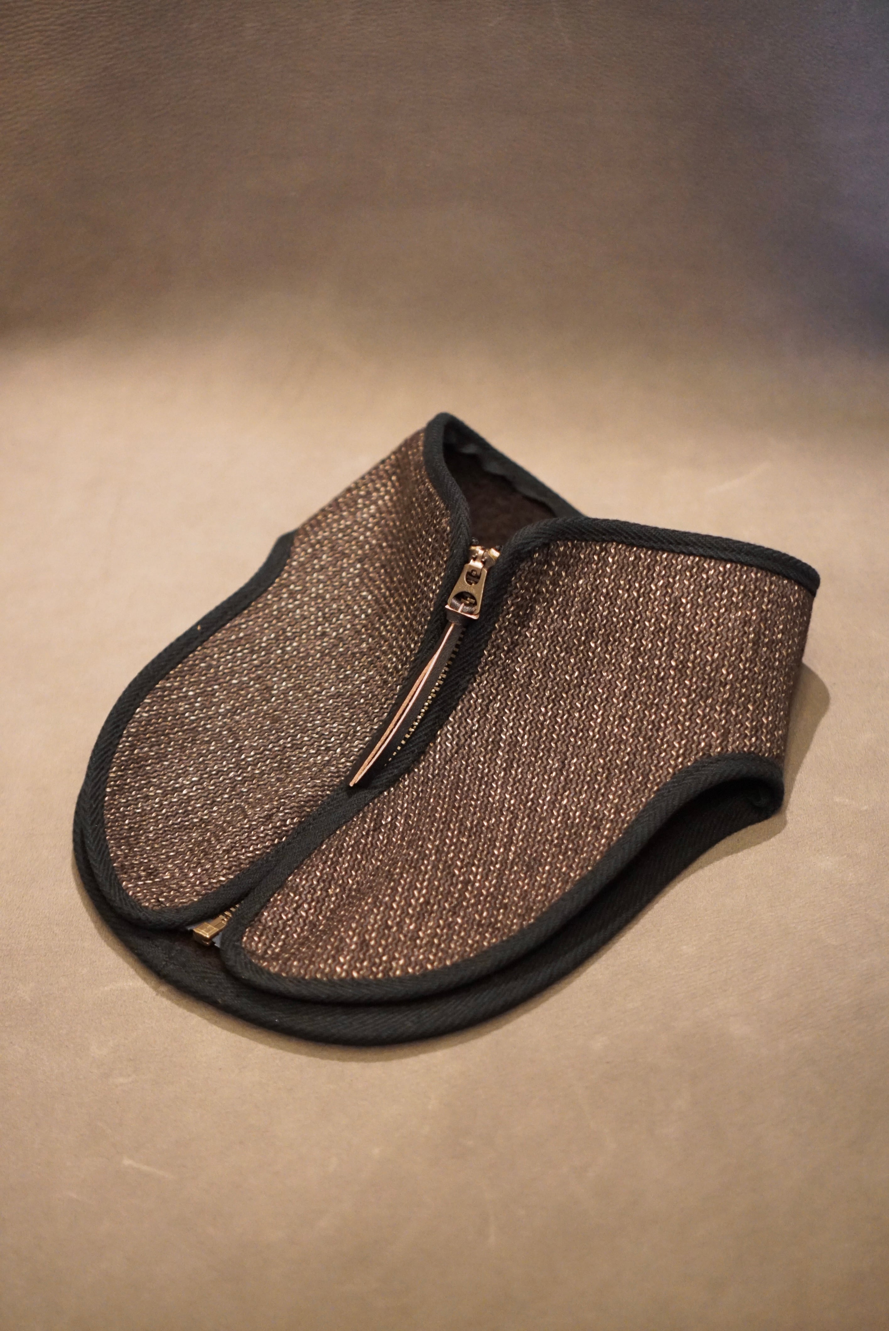 オールドな雰囲気のファブリックでテックなスタイルのネックウォーマーを製作。