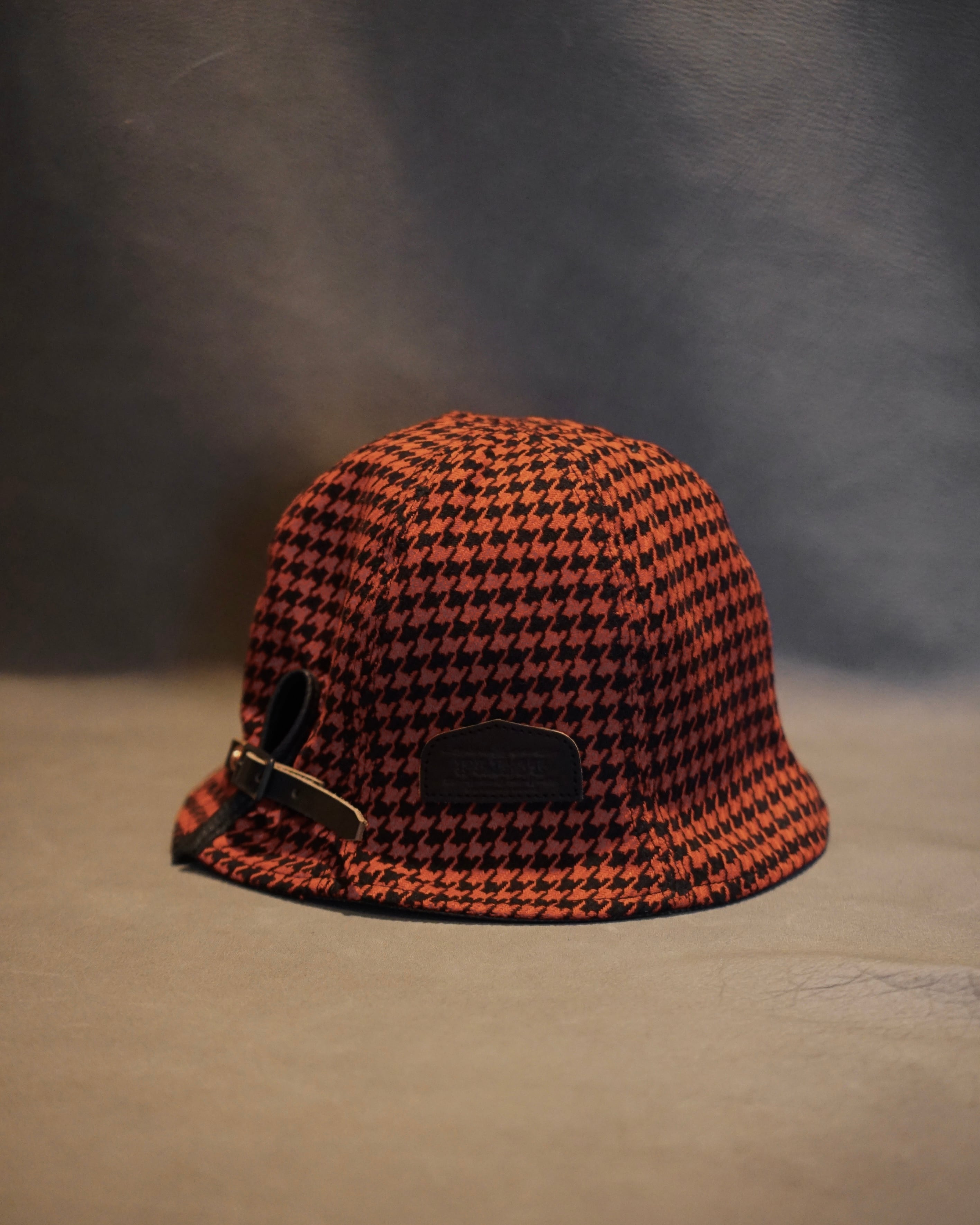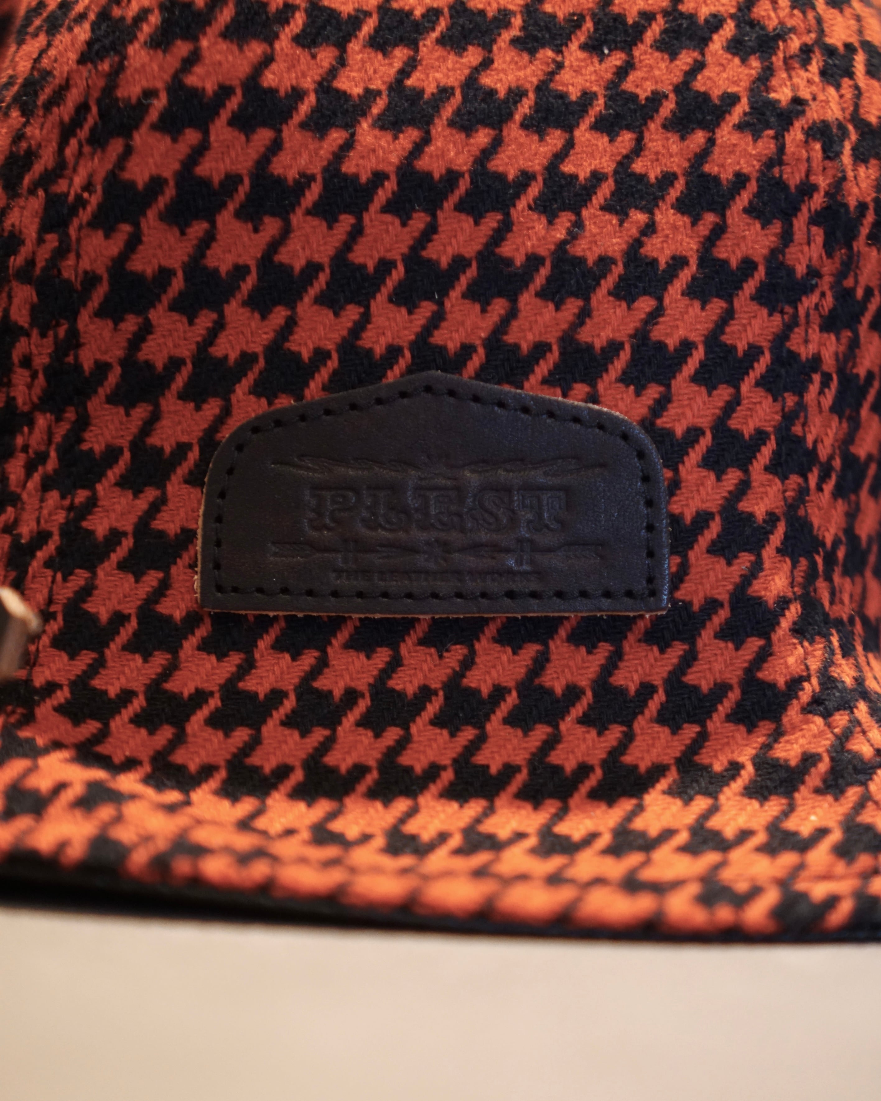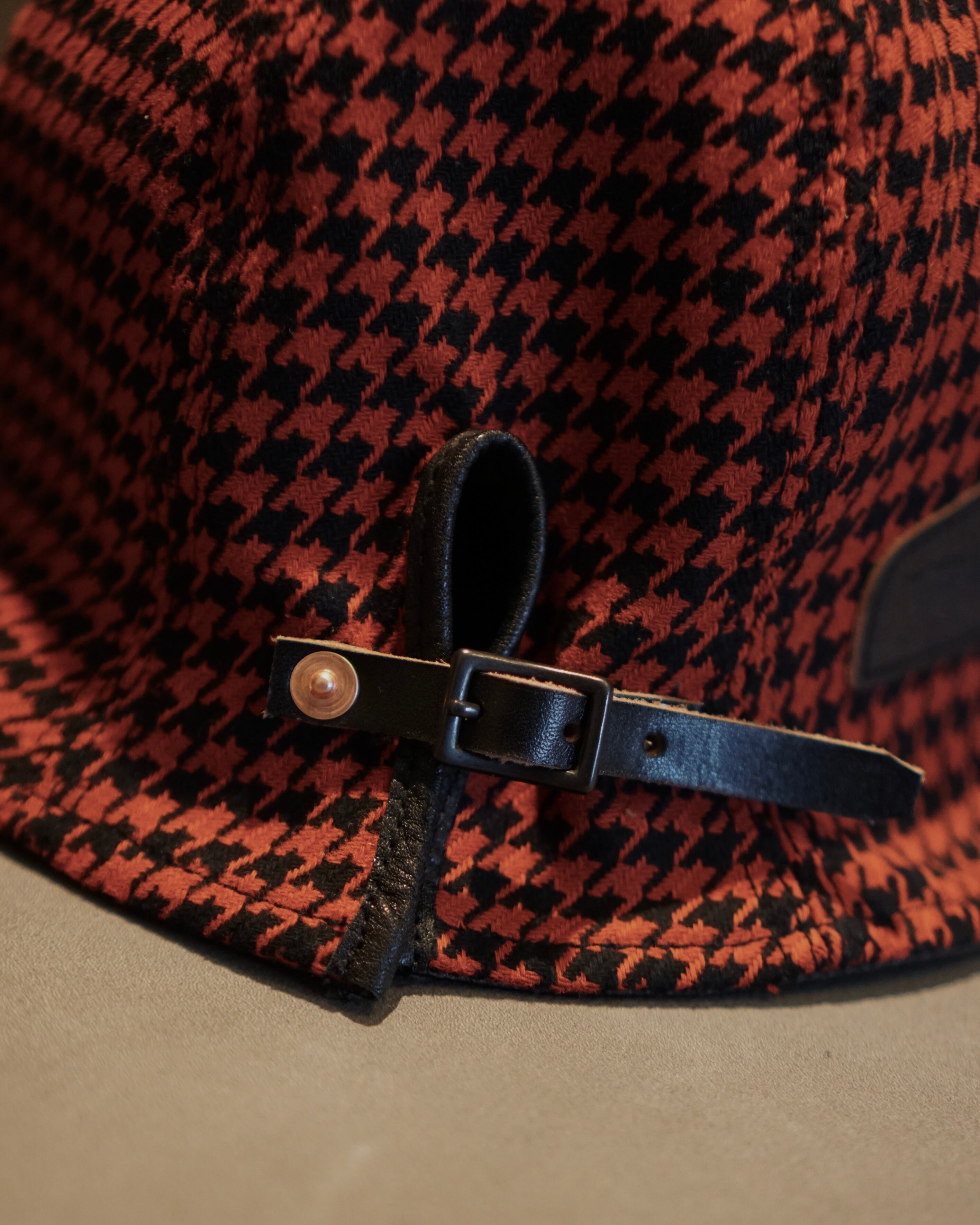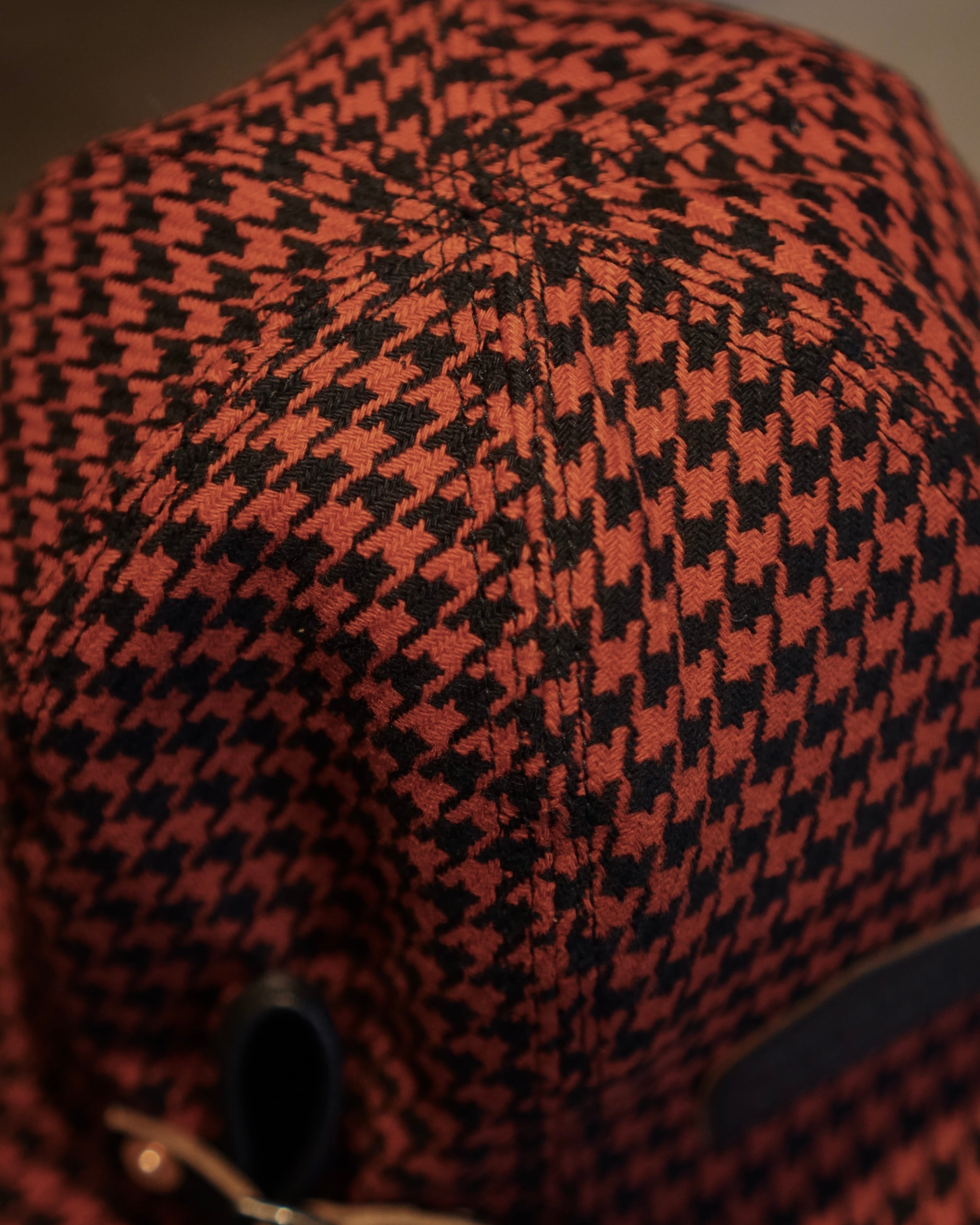コットンヘリンボーン織り千鳥格子ファブリックを用いて上下左右バラバラに柄合わせして仕上げた6パネルハット、ドランカーズハット。